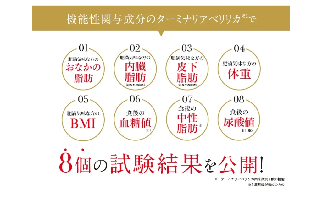 | 有効成分 | ターミナリアベリリカ由来没食子酸 | ターミナリアベリリカ由来没食子酸 + 葛の花由来イソフラボン (テクトリゲニン類として) | エラグ酸 | エラグ酸 | ブラックジンジャー エラグ酸 |